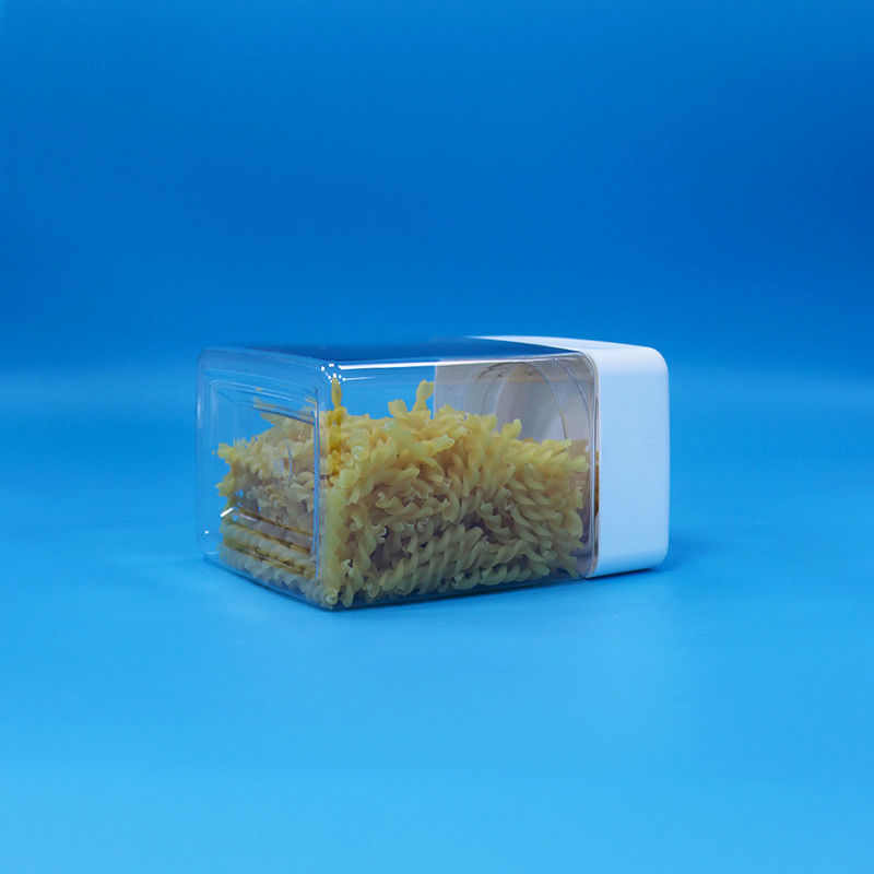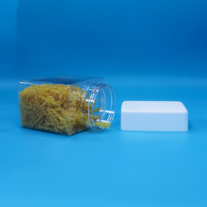 PET doces lanches de plástico de qualidade alimentar transparência frascos quadrados parafusos cima tampas brancas
